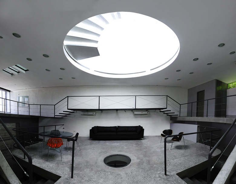 The main and central element of the project is a large dome that consists of a 4.5-meter diameter cylinder. This dome cuts across the third level of the building to illuminate the office space on the first levels naturally.