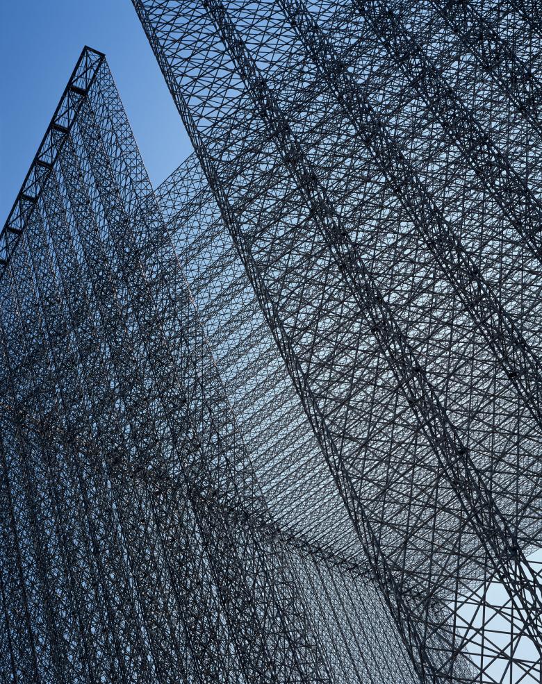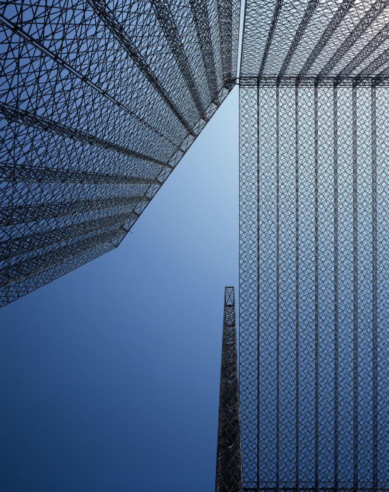 Each portal’s remarkable appearance comes from being woven entirely from strands of ultra-lightweight carbon-fiber composite that lend incredible structural strength. This enables the ethereal portal structures to stand 21 meters high and 30 meters long, without any additional support. From afar the portals appear to be composed of translucent planes, which up close visitors discover are made from hundreds of fine lines of structure.