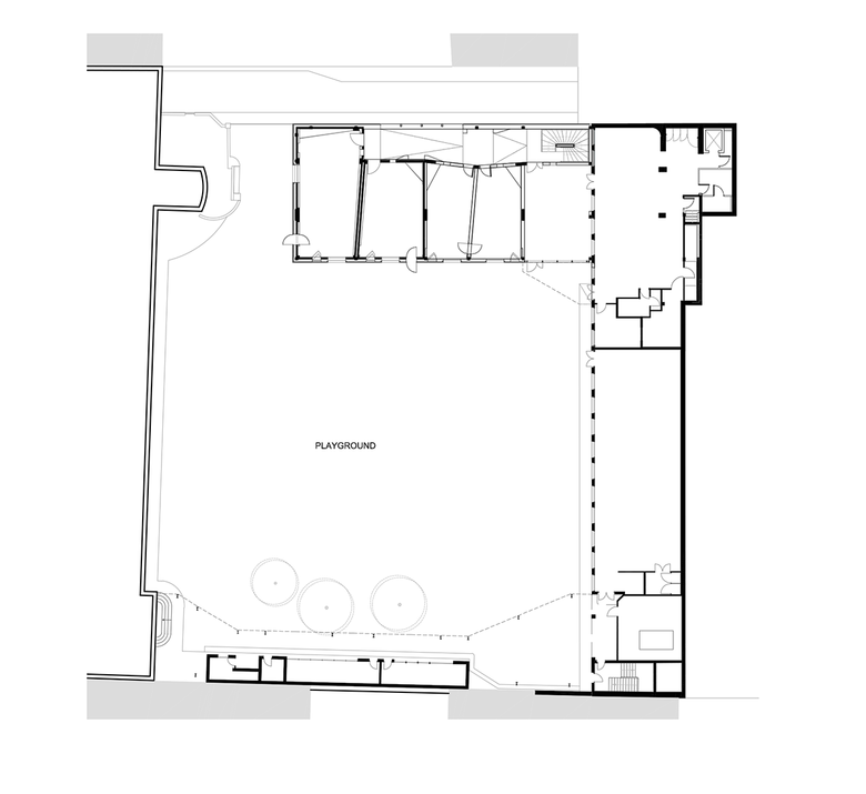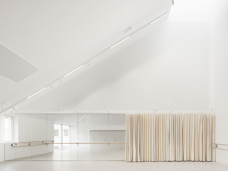 The dance studios on the first floor have wide windows that come down to the floor, overlooking the playground. Large glazed skylights for ventilation bring in extra diffuse light and highlight the asymmetric ceiling that is particularly suitable for use in a dance studio.
