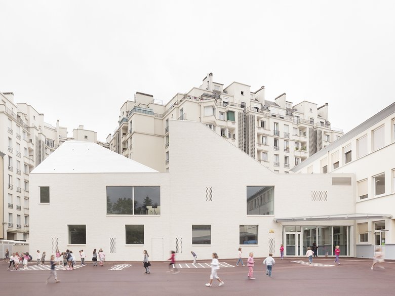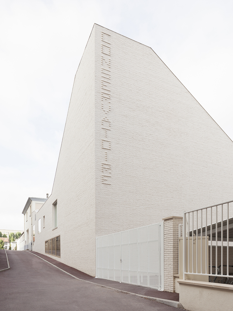 The building is accessed from the street by passing through a porte-cochère that opens onto a passageway. From here the southernmost end of the building can be seen in all its verticality. This stretched volume signals the presence of the dance centre. The building’s pale facade of hand-made brick fits well with the creams and beiges of the neighbouring buildings. Rather than breaking with the context, the building fits into the existing stone-coloured environment, at the same time underlining its own presence with its eye-catching volumes and natural materials. Surrounding homes look over the steeply pitched roofscape with its glazed white tiles, a dancing sculpture of changing colours as sunlight plays across the undulating dance studio roofs.