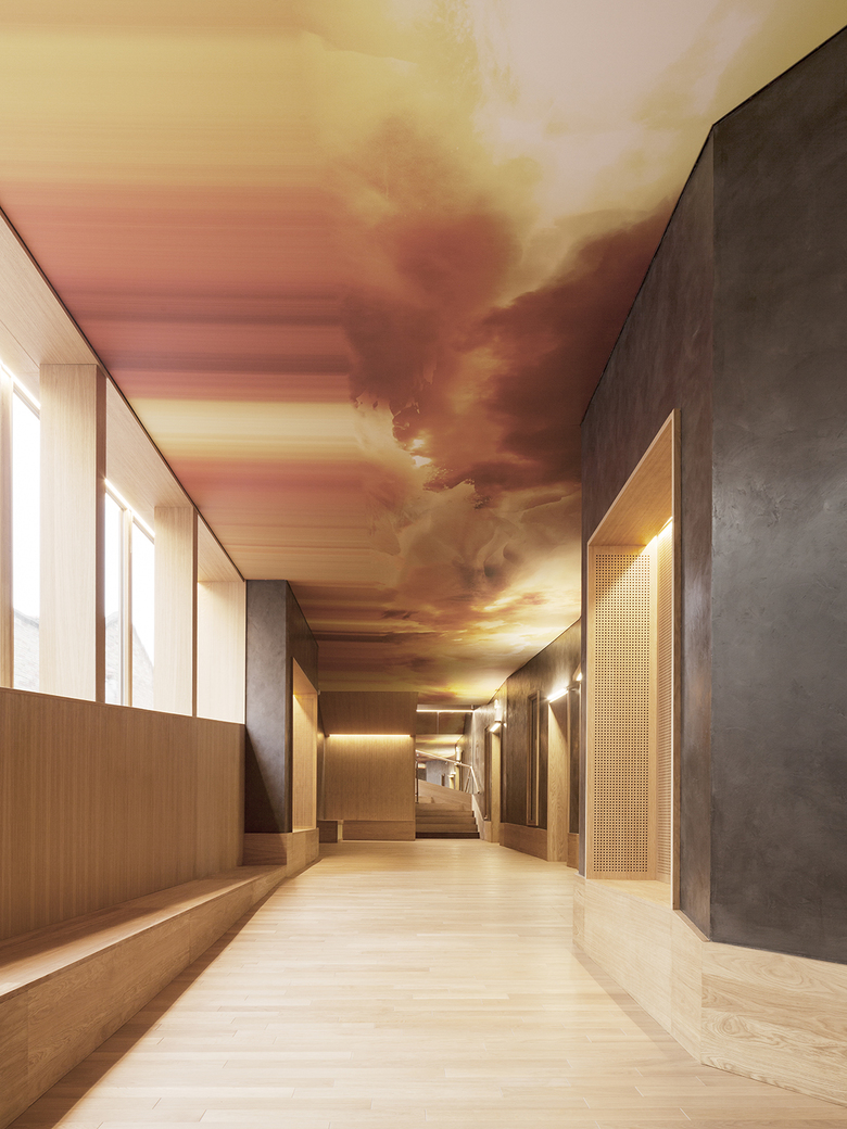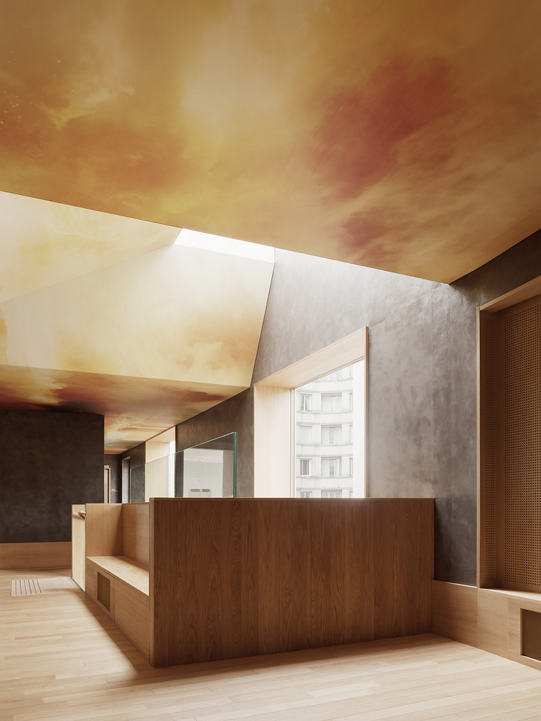 As you walk up the passageway, large windows give views into the heart of the building’s organisation; horizontal and vertical circulation spaces provide generous reception areas and spaces for meeting people, waiting and relaxing between classes. These uses are visible from outside, comings and goings are theatricalised, different activities meet and a relationship with the town is developed. The ambiance inside is hushed. Soft lighting is tinted by oiled oak and the clay-rendered walls. On the ceiling a piece by artist Marie Maillard evokes nature, the sun, the movements of dance and the hum of music. These circulation spaces contrast with the white, light-filled practice rooms. On the ground floor overlooking the playground, two openings are provided into each music room. A large square window frames views of planting at the rear of the site. Its high level sill screens views in from the playground and separates the view from the bustle. A small opening for ventilation hidden behind brick screens allows for manual adjustments to the temperature in the room.