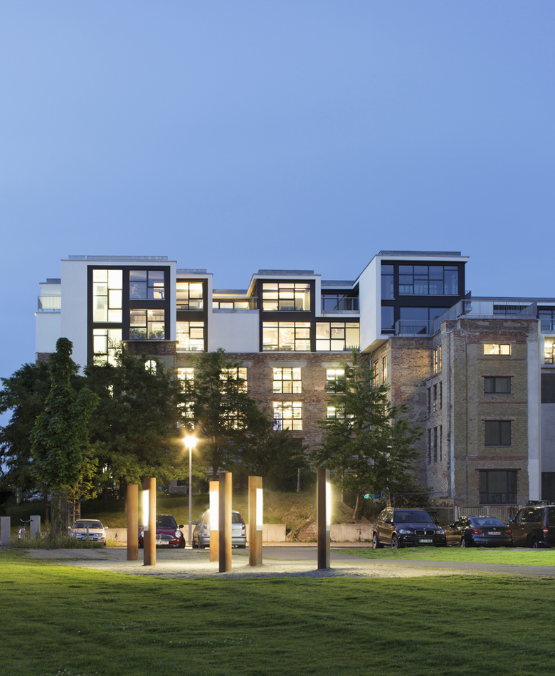 The main building, formerly the Oswald Berliner Brewery, was once a part of the Berlin Wall; the third floor windows facing what was once West Germany served as outlooks for the prying eyes of GDR watchmen.