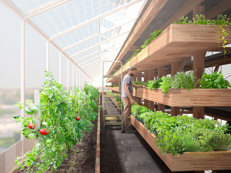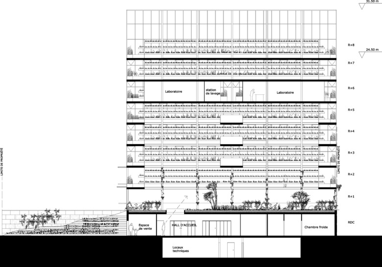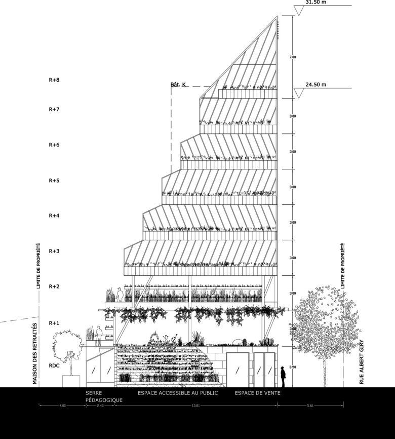 The image of “the idyllic farm,” the “hand of man in the act of building”, the “terroir”, the “natural landscape” and the “social dimension”, seemed most accord with the current theme of urban agriculture. This project is something of a wooden carpenter assembly “anchored” in a natural landscape from which come the virgin vines climb. The architectural image shows a building “implanted” in a “piece of land” that “belongs” to the inhabitants of Romainville city and its future visitors. The approach to this new building is designed so that visitors can easily grasp it and adopt it thanks to the creation of a public-garden space. We are convinced that such a project contributes to improving the living environment, conveyed by the production of ultra-local food, healthy and quality, reducing costs, CO2 emissions and energy requirements fossil. We also believe that this type of project will pave the way for a new way of conceiving the built environment, for it is at the urban scale that it becomes possible to consider virtuous synergies between the project and the people in placing people at the heart of the process.