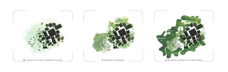 The landscape concept is “Symbiosis with Nature,” which embraces three objectives: planting the future of symbiosis with nature, immersing the wilderness, and balancing human activities and the growth of urban forest. This is achieved by transforming the rigid form of the pavilion into the natural freeform of central forest, maximizing privacy for all users and residents, providing the authentic experience of living in the forest, and providing happiness of living with nature.