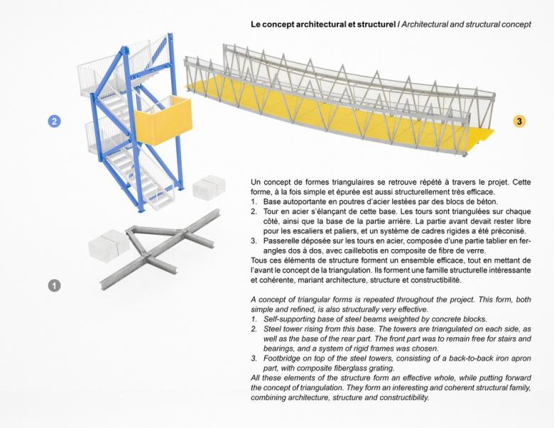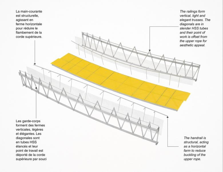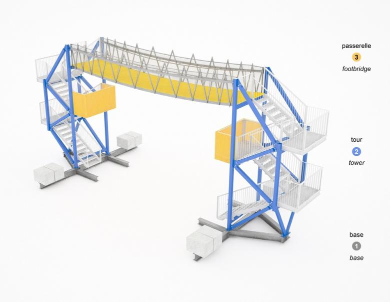 - FunambOule needed to be assembled and disassembled easily. The structure is stored during the winter. The footbridge was therefore designed as individual pieces with specific dimensional and weight restrictions.