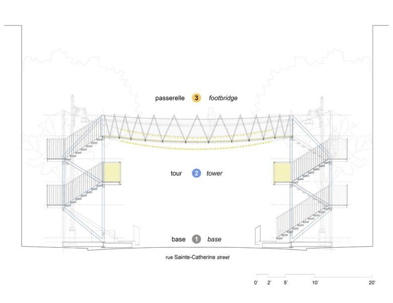 The result of a multidisciplinary collaboration between architects and engineers, FunambOule is a self-supporting footbridge spanning a pedestrian portion of Saint-Catherine Street, in Montreal, Quebec. Designed by Architecturama and Latéral, the footbridge allows visitors a new vantage point where the famous multicoloured suspended balls are at eye level. FunambOule was conceived as a self-standing span that can be disassembled and reassembled at a new location each year.