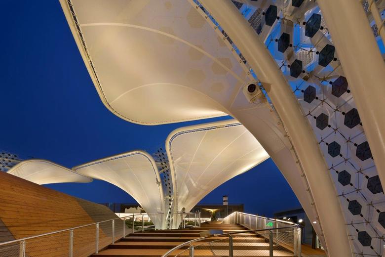 The architect of the pavilion is Lennart Wiechell, managing partner of SCHMIDHUBER, the large Munich-based firm that also designed the German pavilion for the Shanghai Expo five years ago. The display and interactive design is by Milla & Partner, Stuttgart. Together, they conceived a pavilion that allows visitors to choose between two possible routes. The first route, following the outdoor boardwalk, allows for short visits to the pavilion without the need to wait in line. As one moves along the boardwalk (gradually ascending to the second floor), there are lessons about sixteen German regions. Each centers around a large tree-like structure: a steel frame supporting tensile membranes onto which photovoltaic panels have been printed. The energy the trees generate by day keeps them illuminated at night.
