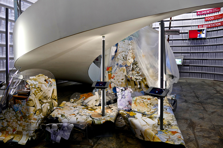 The other route takes visitors into the ground floor exhibition hall. There, a three-minute film introduces the pavilion themes. And there each visitor is issued an iPad-sized sheet of cardboard called a "seed board." The seed board becomes a personal screen; as one walks through the ground floor exhibition hall, sensors in the ceiling read the position of the board and project still and moving images onto it; swiveling the board is the equivalent of clicking a mouse. But the exhibition isn’t all virtual; there are also beautiful "physical" spaces to discover. Lessons about land, water, climate and biodiversity are presented in thoughtfully designed environments, including one with the spatial ambiguity of a James Turrell installation, another a gorgeous room which simulates, with the shape of boxes and bottles and cans, a storehouse. TV screens, moving on tracks across the "shelves," depict methods of food production.