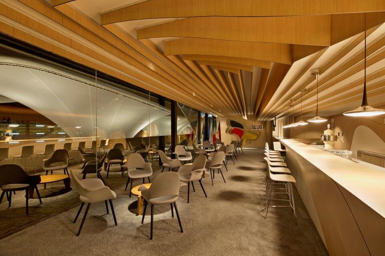 Whichever route a visitor takes — outdoors on the boardwalk, or indoors through the ground floor exhibition hall — it is possible to end the visit with a German meal in one of three settings. The most "conventional" is a top-floor restaurant with sculpted plywood surfaces and photovoltaic panels in artful geometric patterns imprinted on its windows. It is so beautiful that, after the Expo closes, it should move to a German city for the benefit of design aficionados who couldn’t make it to Milan.