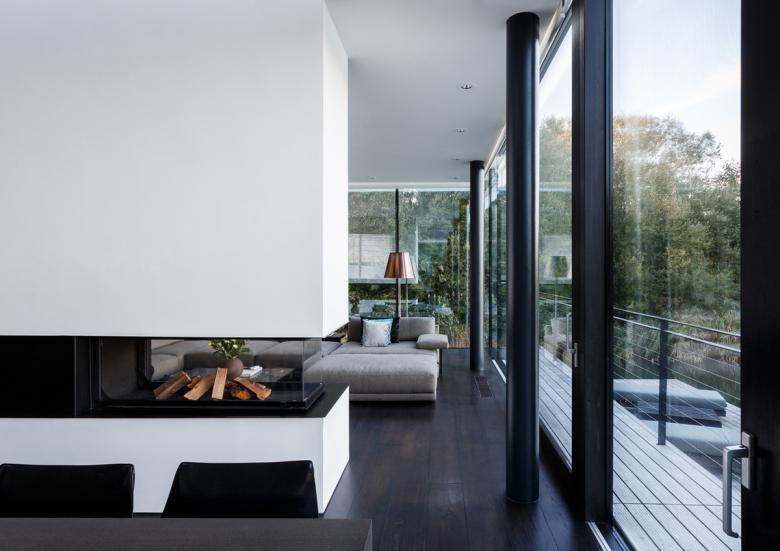 The contemporary home immerses the outside views and nature surrounding the property into the inside, creating a strong and seamless relationship between the house and the landscape. Open-plan living offers views of the lake, trees, sky and nature from every corner of the house, giving guests a very real sense of living outside on the lake yet sheltered in the comfort of their home.
