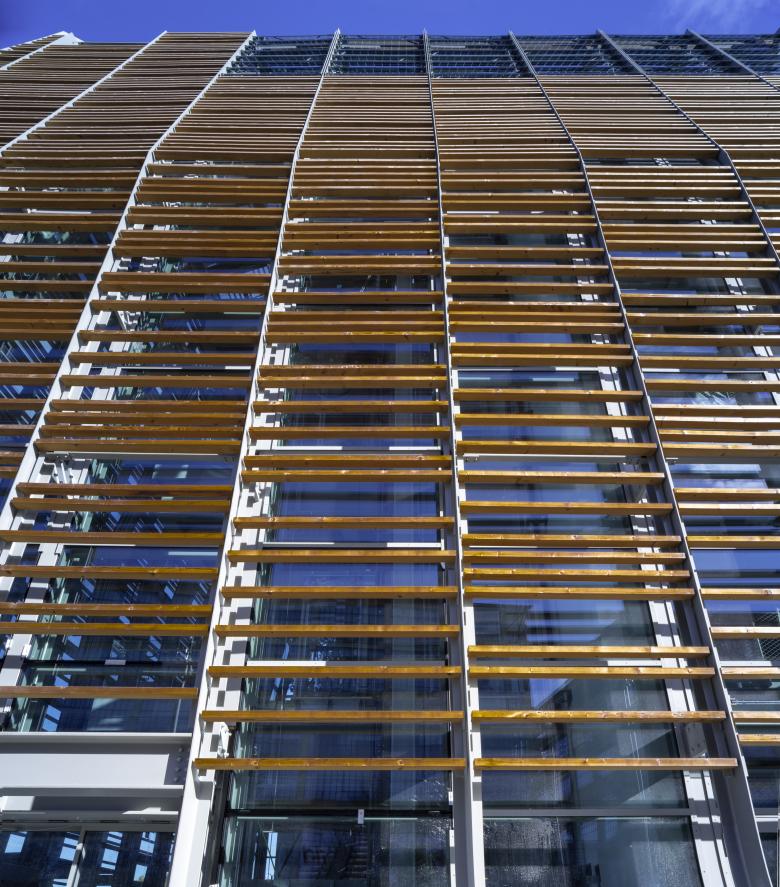 The external envelope consists of a double level of surfaces. An external shell of wooden sunshade slats, supported by a steel rib, forms a technical "treillage" acting as a filter between inside and outside allowing the building to breathe, open up to the city and protect itself from the sun. The slats, heat-treated for external use and stiffened by a metal core, were made with fir wood recovered from the forests of the Trentino Val di Fiemme and Bellunese, destroyed by the October 2018 storm and traditionally used for the soundboards of musical instruments.