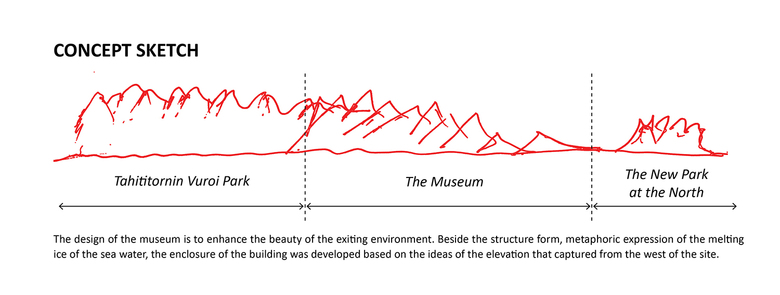 We intend the form naturally to be generated from melting ice on the sea as structure elements. The elevation lines that has been drawn by trees on the park becomes an architectural enclosure. We imagine planting a native seed on the site. It will grow and become a fine medium to connect the sea and the park.