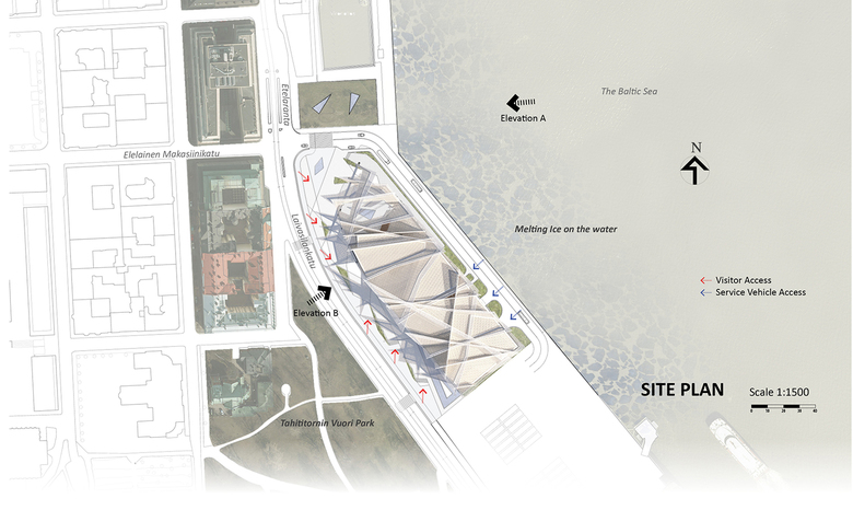 The environment of the city has been related to the Baltic Sea throughout its history. Its climate, culture, business and life are related to this urban fabric. The design site is located right in-between the Baltic sea and Tahititornin park. Its characteristics to render into this city context will be very much excited. By its fine location, the distinctive seasonal change becomes much dramatic elements to bring to the site as a form of architecture.