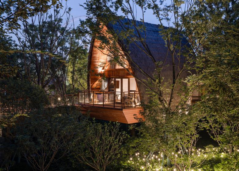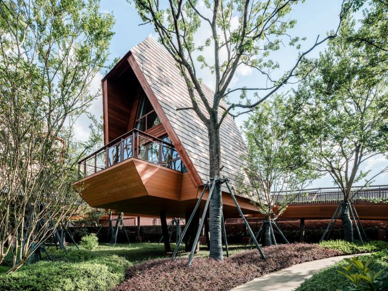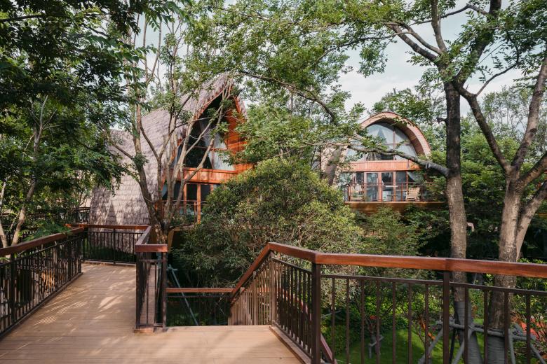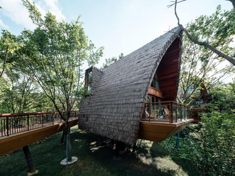 The history of the hotel can be traced back to ancient civilization. It is a kind of shelter with a wide view and practicality, while avoiding danger. We applied the concept into the project, enabling visitors to have a closer relationship with nature. The building is raised to a height of five meters. The elevated building is light and interesting and can have the widest view. At the same time, the height of the treehouse is aligned with the tree canopy. Looking out of the window, there are lush trees, giving people the experience of shuttling through the jungle.