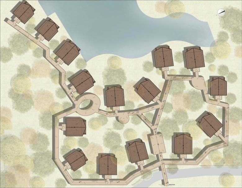 Along the winding and floating plank roads, you can find the house in different positions. At the same time, the plank road is connected to the second floor of the inn, leading people to the room area. On the plank road, we set up slides, slings, and other entertainment facilities, which are connected to the ground garden vertically and convenient for children to play. At the same time, there is a leisure space for viewing, allowing people to gaze out and relax among the treetops. The overhead of the trestle bridge and hotel allows the ground floor to escape to the maximum, reducing the impact on the surroundings, and also creating a free panoramic garden. Under the shelter of surrounding buildings and trees, it is also cool and comfortable in summer.