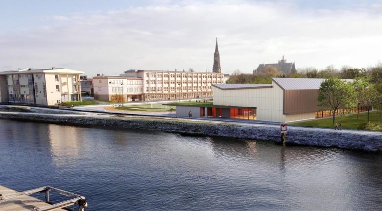 The new gymnasium is located on the site like a ship’s bow, facing the Louis de Cormontaigne High School building, a three-story structure housing the classrooms between the Moselle River and the canal and facing the motorway, which is the site’s main acoustic challenge. The decision to place the playing field between the two buildings creates a welcome distance between them. It makes it possible to suitably meet the need for working continuity with the present gymnasium and the entire high school having to continue to operate until the new complex is delivered.