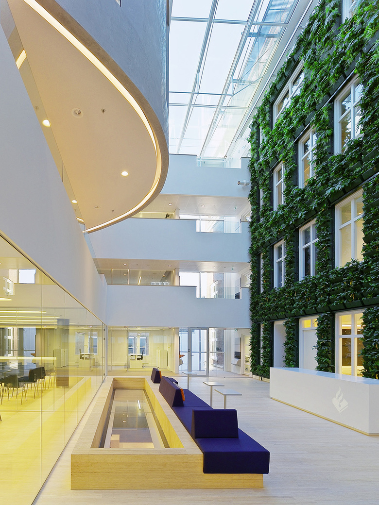 The police attach a great deal of importance to future-proofing the building. This meant that close attention had to be paid to flexibility and adaptability. The careful combination of hot-desk work sites, individual offices and meeting spaces means that departments can grow or shrink easily. We also gave a lot of attention to sustainability. Improving the effectiveness of the partially reused installations (for example by introducing new control systems) has made the building much more energy-efficient. The materials used were also selected on the basis of minimal environmental impact, while the atrium has been provided with a four-story plant wall for a pleasant and healthy interior environment.