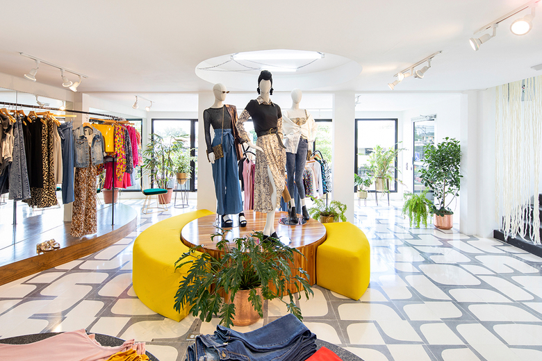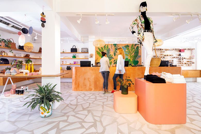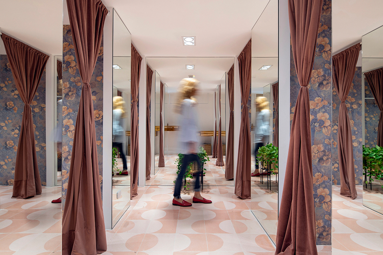 The second level, devoted to casual wear and basics, is defined by a neutral palette and hand-made materials, including soft two-tone geometric pink floors, sand-colored stucco walls and textural accents, such as a yarn curtain and dark green velvet sofa.