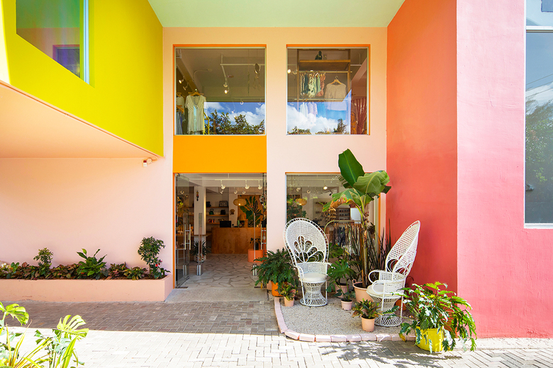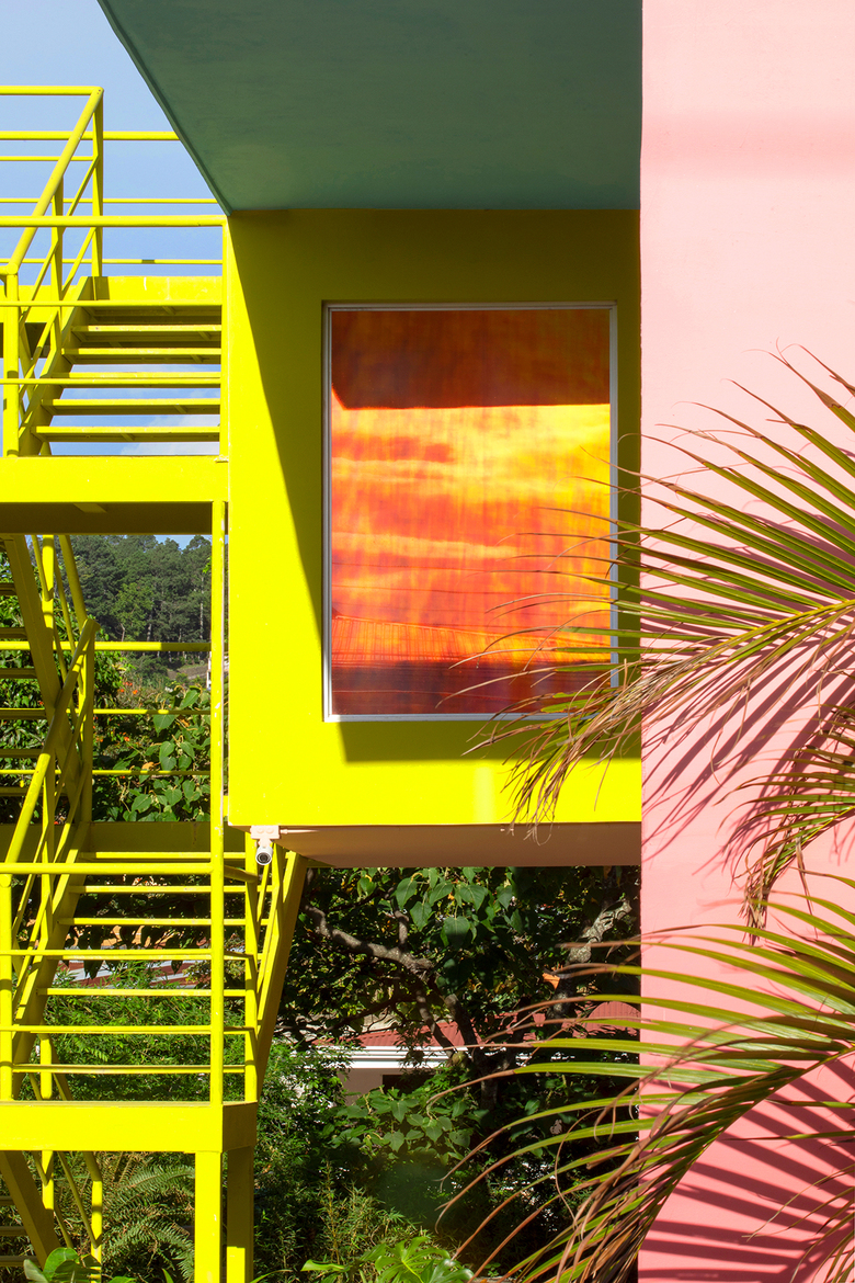 The existing building already consisted of several previous additions. Taller KEN added new elements, including an exterior elevator core and exterior stair, color-coding both new and old volumes so that the building appears as a cohesive, playful, stacking of boxes which create a play of color throughout the day. The firm cleaned up some of the facades to take away moldings and other interruptions for a cleaner, more defined box, and added colorful, reflective window coverings to hide storage areas. The bright colors, inspired in part by Latin architects Luis Barragán and Ricardo Bofill, create a fresh tropical vibe that reflects the context of Costa Rica, the brand’s millennial clientele, and the merchandise itself.