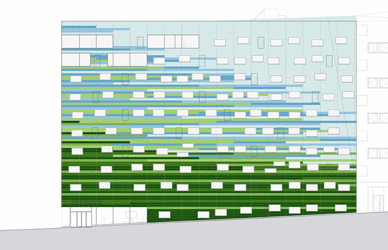 The lower section in a variety of quite dark greens creates a base, the darker shades reducing the noticeable effects of dirt, giving a clean, shiny, lasting look. The green tones continue the great line of trees opposite the west facade of the project.