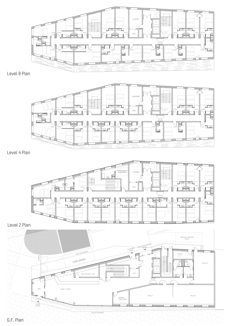 The resulting volume is tapered: different inclining planes allow for fire access along the eastern facade, while lost space is clawed back on the Boulevard d’Indochine side. Further along, where the hotel meets the student residence, the same crisp angles carry through to this second building; the two projects, hotel and student residences, are powerfully related to one another.