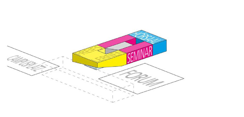 The master plan for the "Hochschulcampus Osnabrück" (college campus Osnabrück, Germany) is the framework which includes the first building blocks (library, Forum, university building, campus and mensa). The centrally located university building is situated where in the future the campus area and the Forum will meet.
