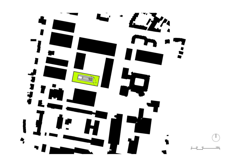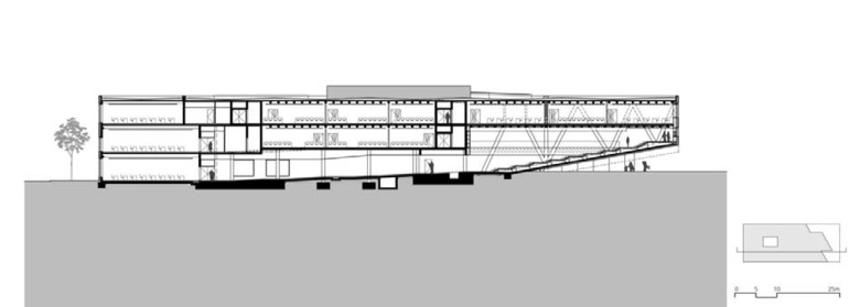 The layout (as three adjacent sections) leads to a clear, simple and compact floor plan of the university building. Classrooms and emergency staircases are situated on both sides of the building; in the middle part are the lobby, technical rooms and courtyard. The large lecture halls are perpendicular to the main direction of the building, and get their natural light from the courtyard. Due to the existing topography, the heights of the land is used in the new building, making it clear and simple to create the requested higher ceilings in the lecture halls.