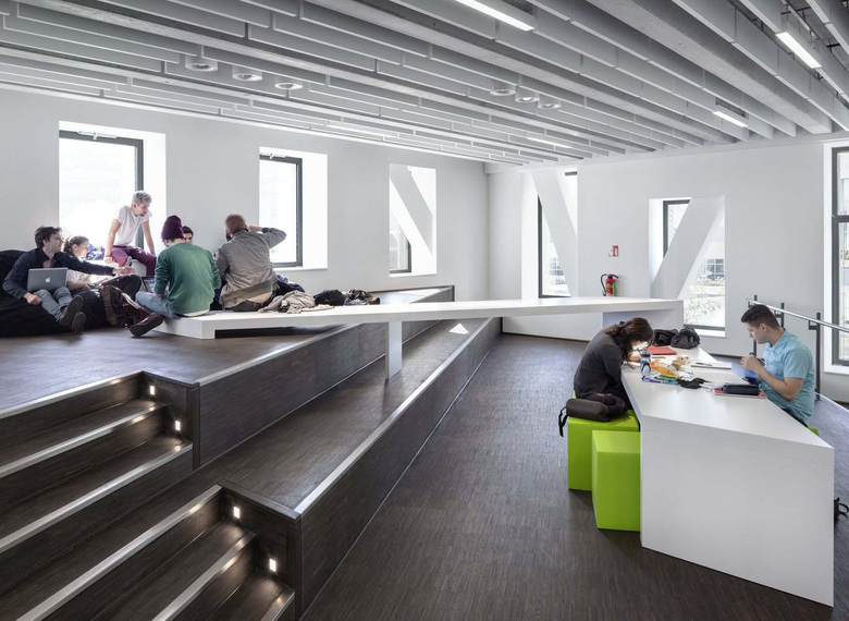 Free "learning zones" will become increasingly important in education. After all, nowadays digital information is always available everywhere: laptops and tablets are mobile, constantly accessible sources of knowledge. People using these media can connect and form flexible groups anywhere and anytime. The question is to what extent the conventional layout of a university building still meets the requirements of these new behavioral patterns. Perhaps spaces with a flexible layout are a necessary complement to the traditional lecture halls. These considerations are the basis for the development of the learning landscape in the new university building.