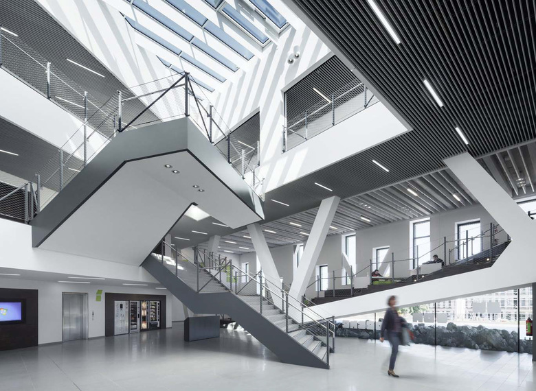 Upon entering the building (under the cantilevered section of the building) the hall opens upwards: open space along all floors creates a feeling of generous spaciousness. The glass roof allows natural light to flow through the entire lobby. This space can be used by the university, but can also be used for non-university events. The central atrium and green courtyard are special areas in the tightly organized building volume, which can be experienced in different ways and provide simple and clear orientation for visitors.