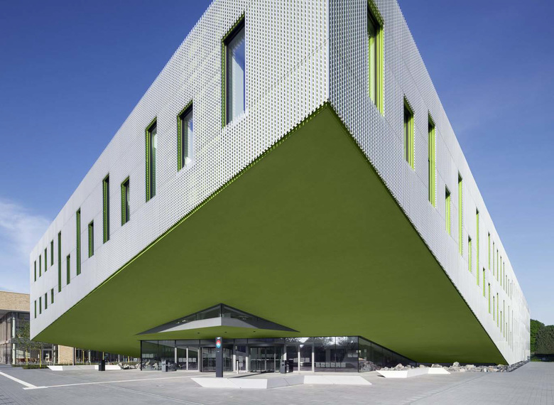 The outer shell is designed as a two-tier structure: the building volume is coated with an insulating green foil membrane that protects the façade against wind and rain. On an aluminium substructure, a coating of folded panels – on the sides perforated aluminium panels – are mounted. The perforation of the metal skin creates a varied, lively view of the façade: you can see glimpses of the green building shine behind the metal. The anodized aluminium panels have a soft, almost velvety surface and give the building an important, yet friendly and inviting appearance.