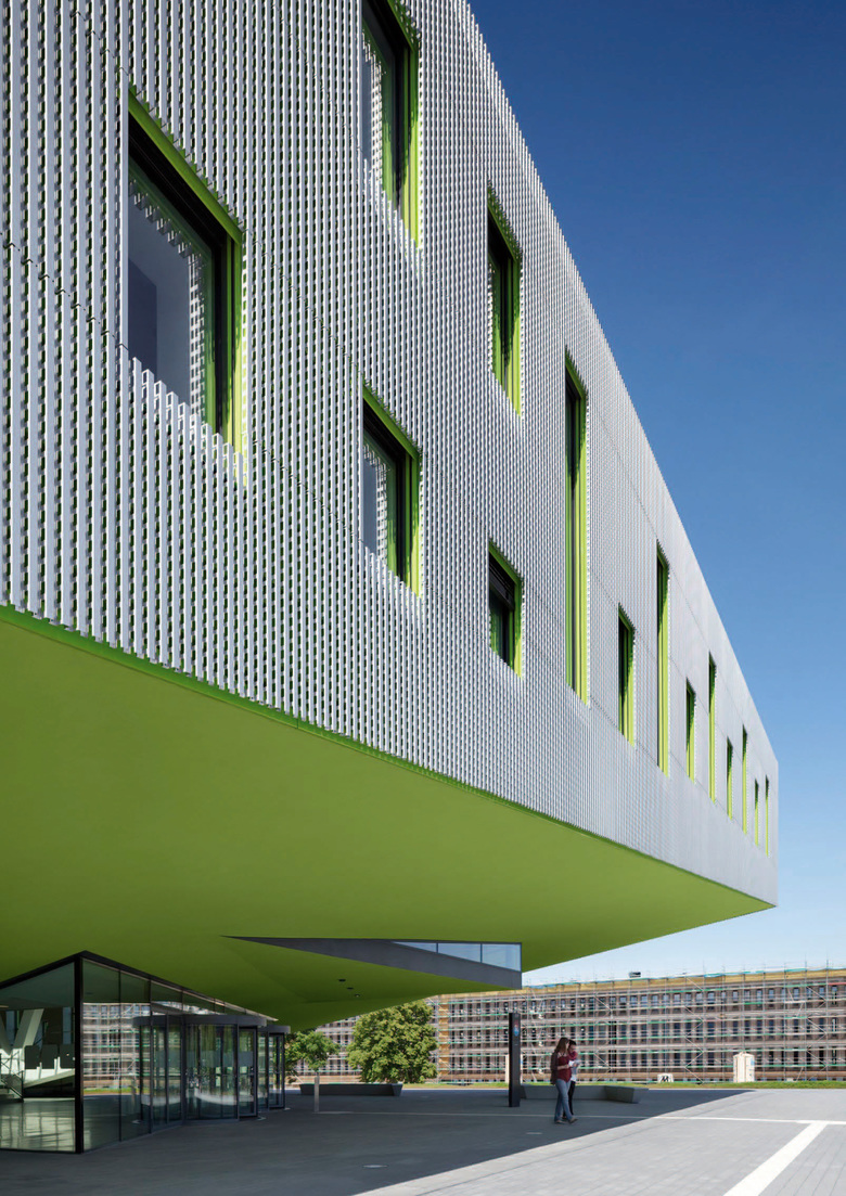 The colour green refers to the origin of the university, which has its roots in the Faculties of Agricultural Sciences and Landscape Architecture of the former agricultural college. This fresh, stimulating and inspiring colour gives beautiful, striking and contrasting accents to a building which is mostly characterized by the use of restrained colors and materials.