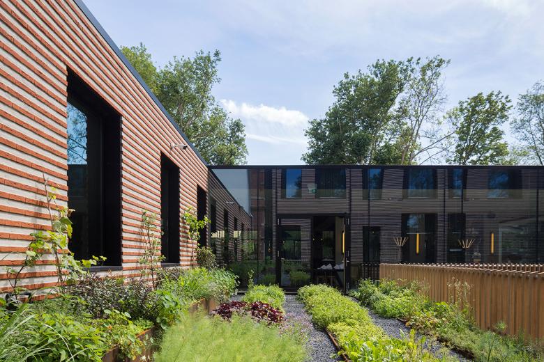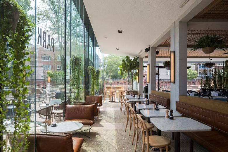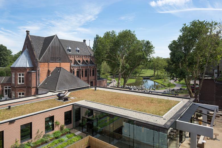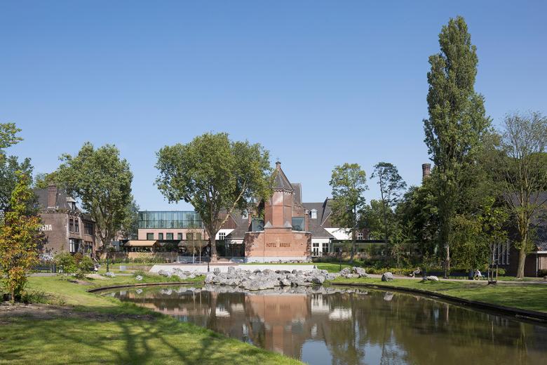 On both sides of the restored chapel, two new transparent pavilions, containing a restaurant and studios for events, overlook the Oosterpark. Their full height glass facades create a seamless connection between inside and outside, where a spacious terrace facing the park enjoys the shelter of the chapel. "Hotel Arena is a place where the history of Amsterdam is evident, while at the same time it is a very contemporary city park hotel where things are actually happening. This combination offers a unique 'local experience' that appeals to both tourists and people from Amsterdam." The building is designed to bring back the focal point of culture and events back into Hotel Arena and allows owner Paul Hermanides, a true Amsterdammer, to fulfill his dream to facilitate unexpected encounters between people.