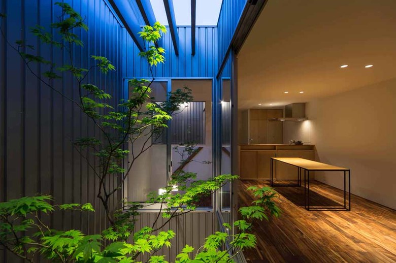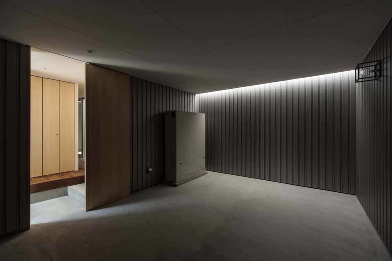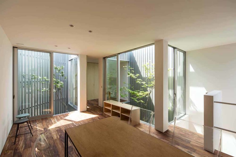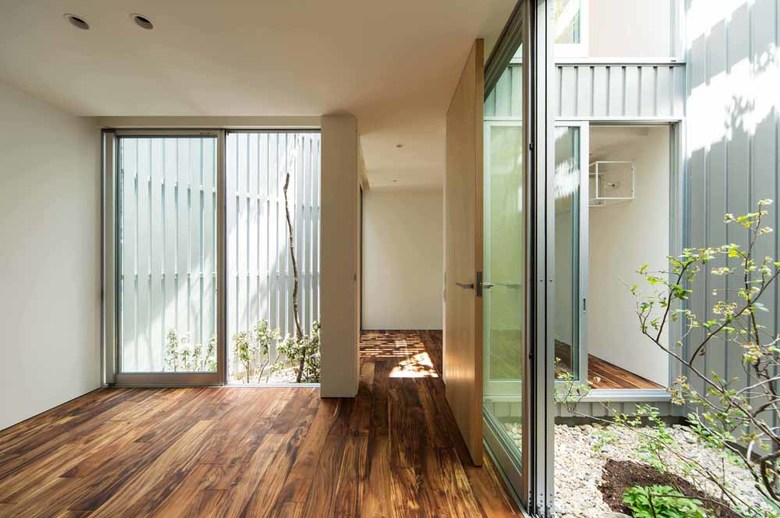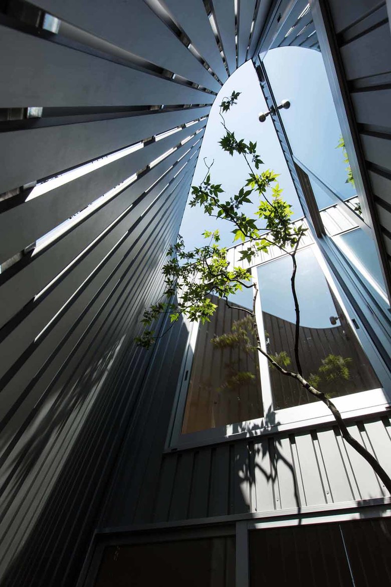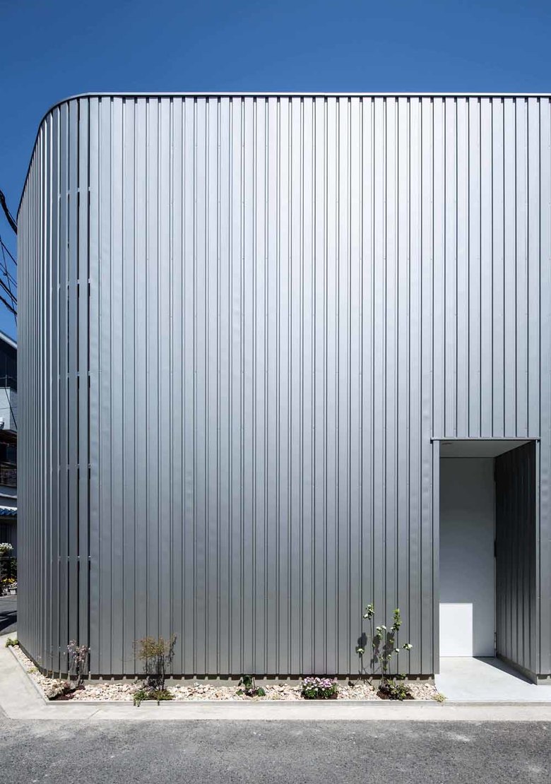 As for ventilation, we set galvalume plates with the same quality as the main exterior wall of material, color, and shape, in very narrow intervals at two areas of the exterior (road side and courtyard side) to create layers of slit. This enables to shut down people’s looks from the outside and only wind would go through!