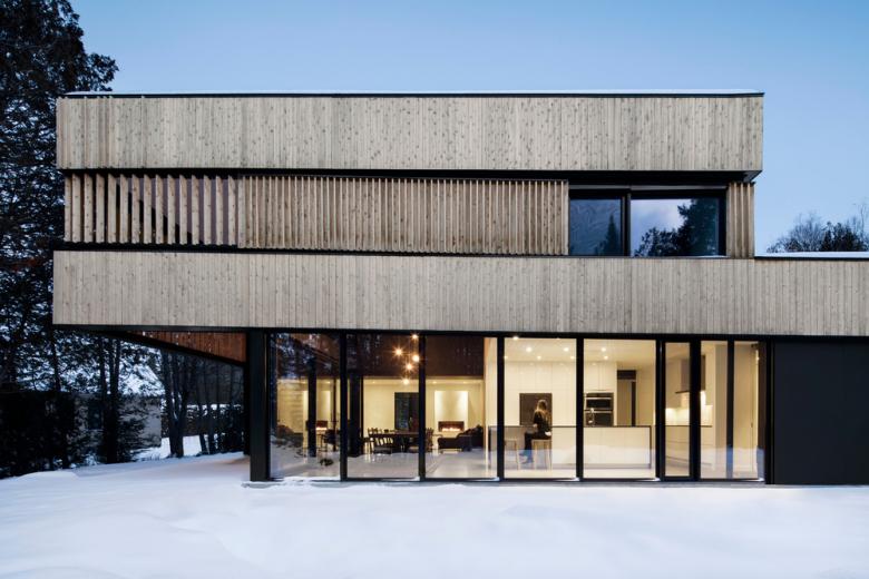 The residence is intended to be approached from the south of the site. Upon arrival, the overlapping horizontal bands that extend from east to west highlight the concept of the wooden enclosure. The hemlock paneling shifts from a semi-transparent substance, hiding the inner courtyard at the entrance of the house, to a more conventional opaque envelope. Large horizontal windows reflect the surrounding nature and the nearby lake.