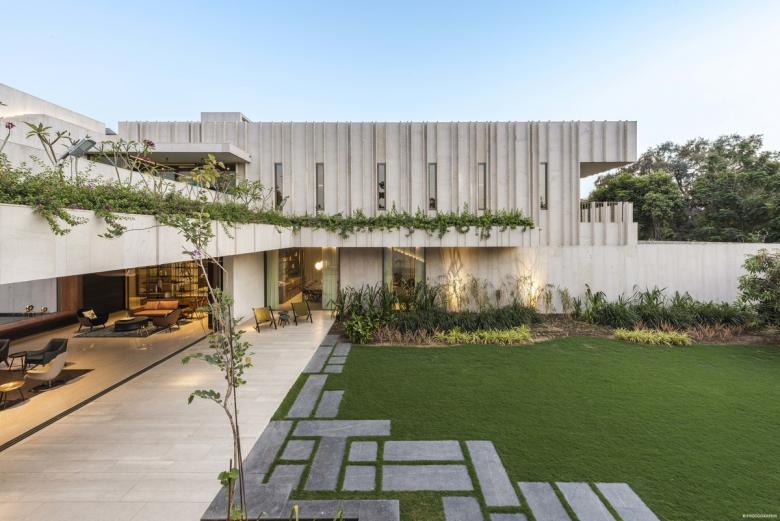 This is a private home in Ahmedabad, is an expression in Dhrangadhra stone. The stone used in many of the architectural antiquities of Ahmedabad. The stone has a mottled texture and bone coloration, available in blocks; slabs and dust from quarries nearby it became an obvious choice.