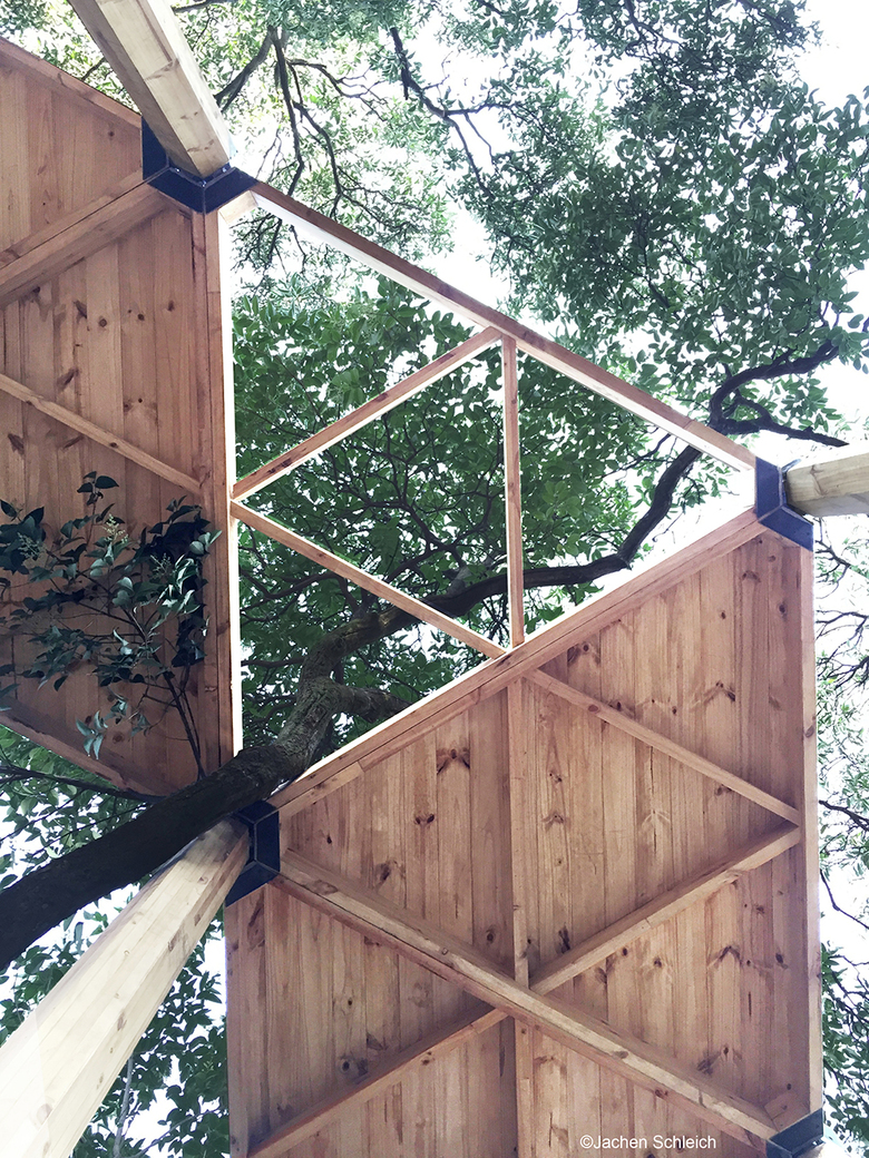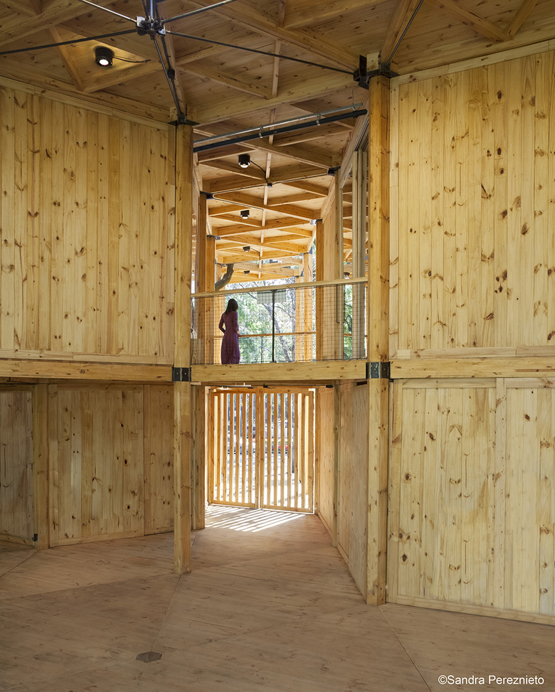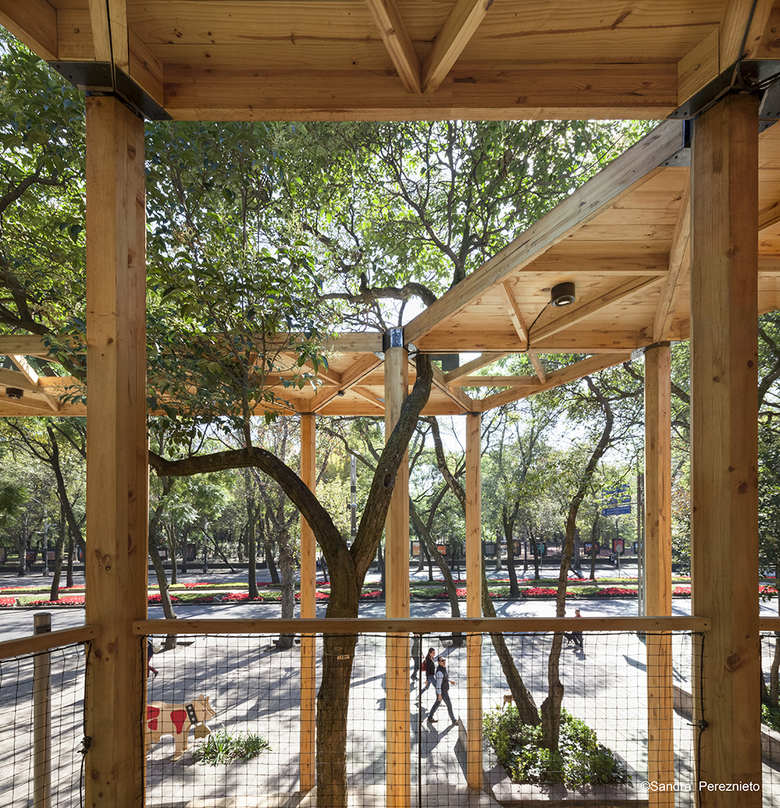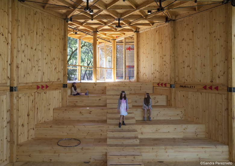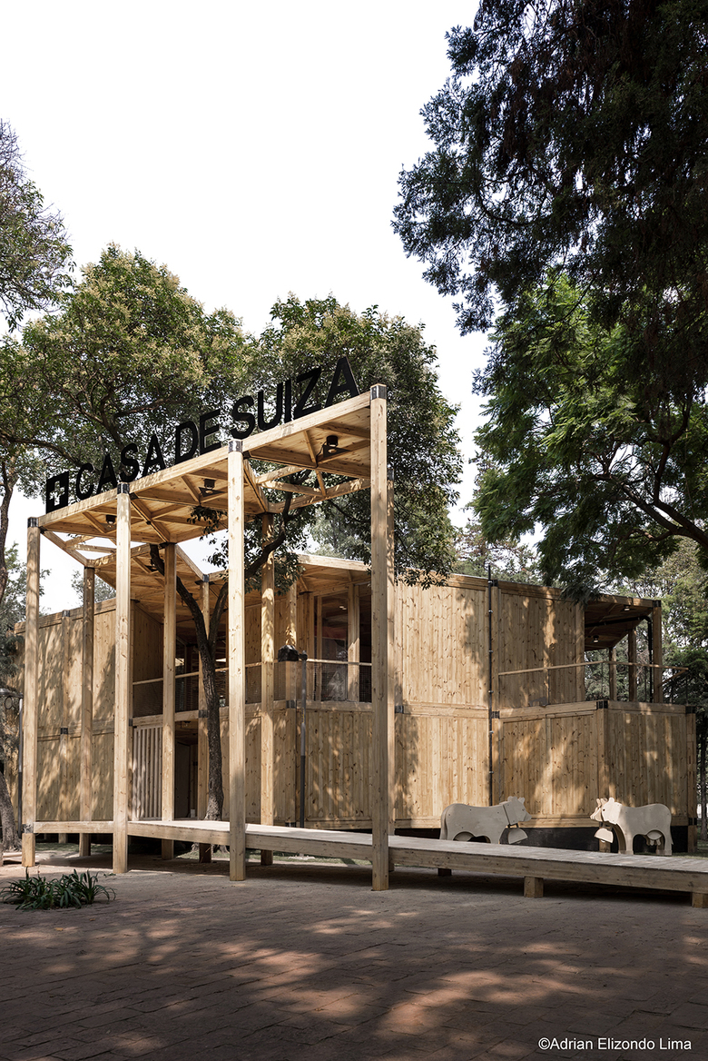 The design of House of Switzerland abides by the materiality of the original House of Switzerland made entirely of wood, a traditional way of building in Switzerland. The pavilion is designed in modules made of certified pine wood and metal joints, promoting the use of wood as a structural material in Mexico. These modules are derived from the triangular grid, which guarantees and efficient assembly and disassembly of the structure on the site. Prefabrication and assembly are carried out by the company "Metal y Madera".