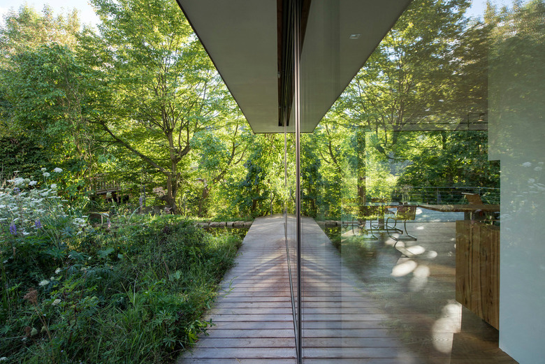 Not even two complete exterior walls are designed as masonry, but minimal steel supports and a steel frame allow fully glazed facades. To the water side, the filigree three metre high glass sliding doors can be pushed to allow two-thirds of the glass wall to be opened. This creates a seamless transition onto a timber deck with a wide view of the Rheder country park.