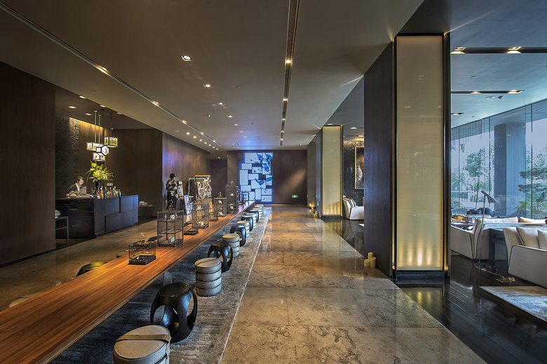 Some space on the sixth floor and podium has been built with an indoor sunk-courtyard landscape that opens to a reading room, so guests can indulge themselves in this natural elegant environment. Hotel’s Chinese restaurant “YUE SE” is inspired by Lingnan (south of the Five Ridges) culture. New Chinese style associated with outdoor waterscape, giving an aesthetic touch. Western restaurant is located on top floor with a great view of central park. The book bar has a street frontage but without window, which avoids the noise and dust influence. The inner sight, calm stream and green war combined with reading room’s cultural display, an ideal place for reading.
