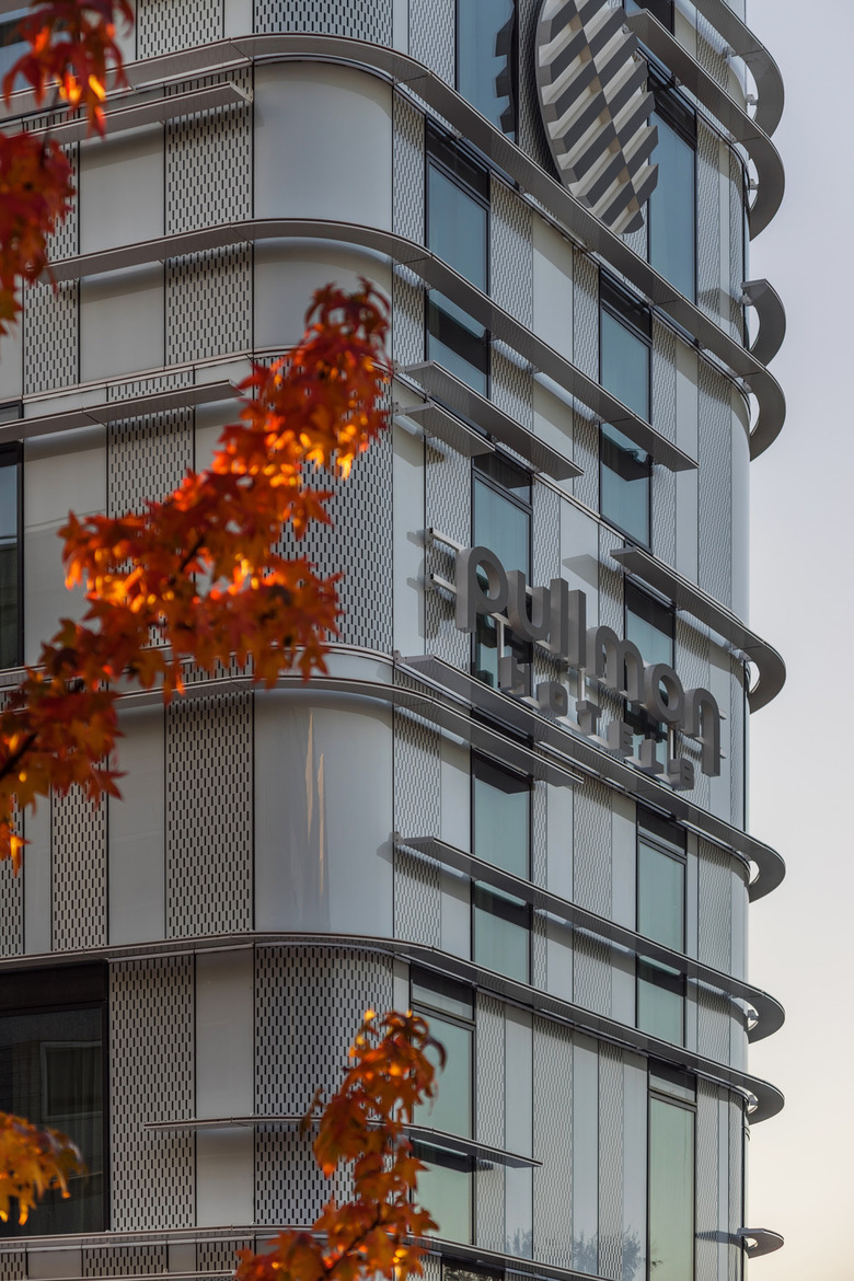 The gap between the hotels creates a convivial space that is partially protected by a glassing in the form of flower petals; a true catalyst for city life, a place to drink, to share moments or just go through. The street level is lively. The activities offered generate commercial activity. The two hotels’ reception areas and restaurants are glassed and enable customers to enjoy a view of the outside. The Pullman street level’s generous height opens onto public space and enables satisfying both the hotel owners and users but also the city and its passersby.
