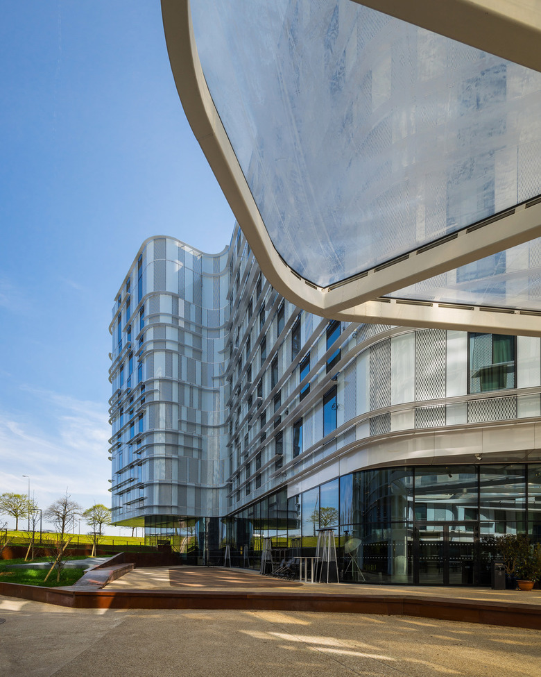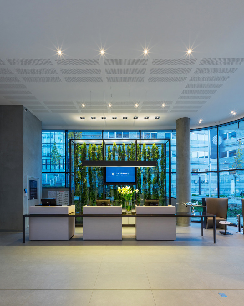 The hotel project was designed to seamlessly integrate within its nearby environment, in articulation with the “Dome” and the future nearby tramway terminal. Right in front of the train exit, the two IBIS STYLES and PULLMAN hotels share the same kind of outline and their frame are innovative. Despite its thin silhouette and irregular facade in front of the Dome, the hotel center creates a strong visual impact, making those buildings appear as doors to the city.