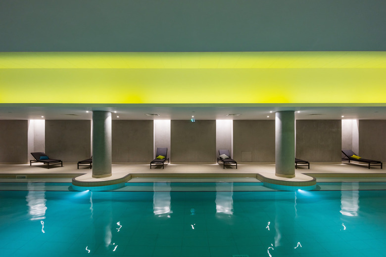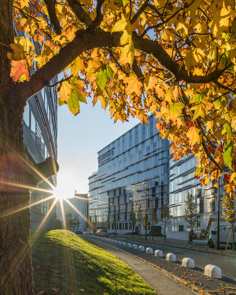• Silk-screened glass partially covers the glassing, drawing an aesthetic and modern checker board pattern. An optical illusion is thus created along the buildings’ frames.