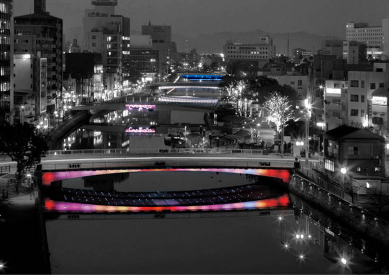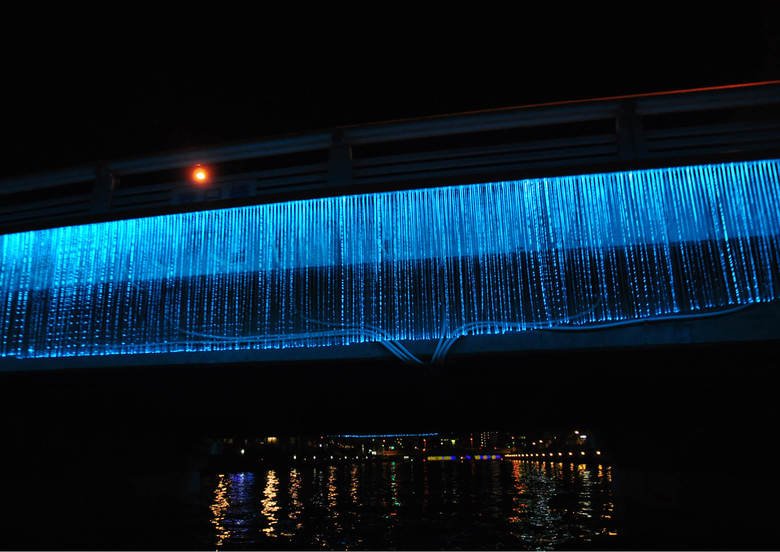 Kasuga Bridge is located over Shinmachi River in Tokushima City, Japan. The bridge is 48.6 meters long with a bridge clearance width of 18 meters. The installation is designed with consideration of the safety of passing cars above and boats that pass underneath. To mimic glistening falling water with lighting, the design required extreme consistency with varied treated patterns and length of the each fiber optic. Each side of the bridge is constructed with 32 units of hanging fiber optic lighting. Each unit includes: