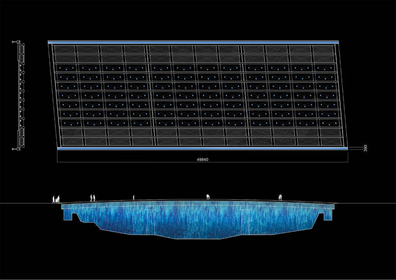 Inspired by both the past and present industries of Tokushima City, the designer merges and highlights the importance of both industries in its development of the city. Tokushima City was built by the indigo dye industry; big indigo storehouses occupied both waterfronts surrounding Kasuga Bridge where white walls and blue stones were reflected onto the river. Tracing back to its history, the Indigo Waterfall gives new remembrance to the surrounding indigo storehouses by utilizing Tokushima City’s new thriving LED industry and its surrounding natural beauty. By connecting light, nature, local culture and people, the installation creates a new image for Tokushima City.