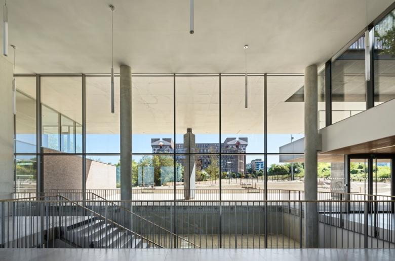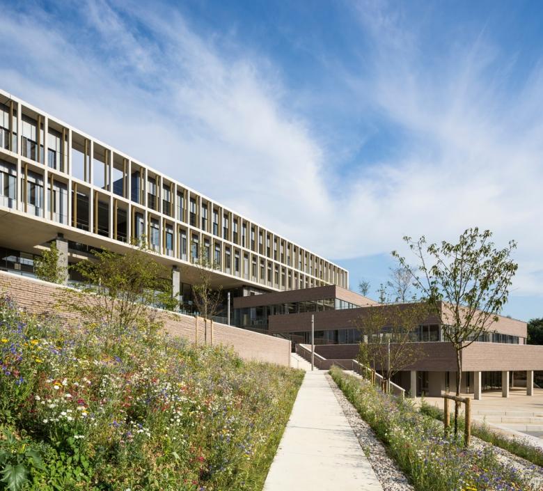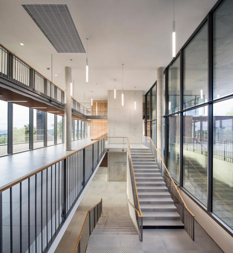 - The immediate landscape of a planted steep slope. With landscaped terraces, the introspective high school found its place attached to the functions shared with the boarding school (dining, sports hall,...).