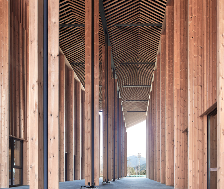 The building consists of two volumes combined by a roof. Wood is the dominant building material for the facades and in the interior. The overall impression when seen from afar is of a large agricultural barn in the countryside.