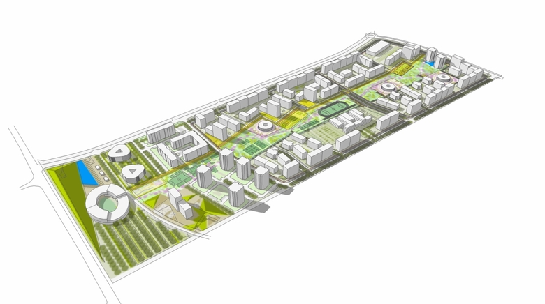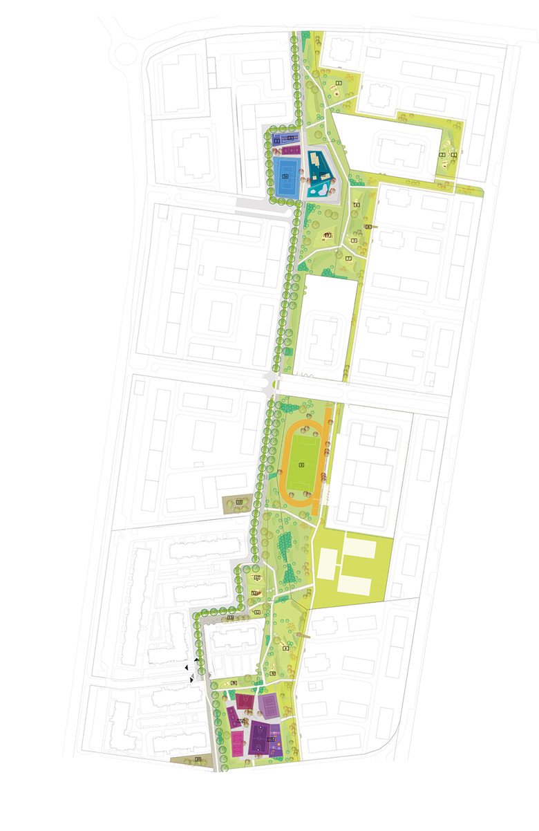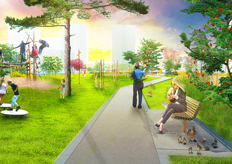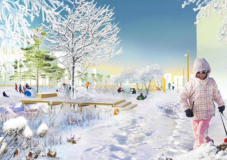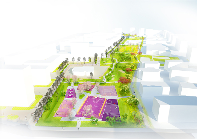 To activate the park, the functions and facilities which are normally located within the block are centralized. Sports facilities are combined into public sport clusters. Together with the kindergartens they create neighborhood destinations in the park. Playing areas are integrated in a 3-dimensional landscape. Grass hills with playgrounds alternate with depressions, which may temporarily fill with water. Specially designed squares along the boulevard in the west, and wooden piers along the flower path in the east, connect the park to the neighborhoods. The aim of the park is to create a public space which can be used during the whole year, offering an enchanting realm in every season.