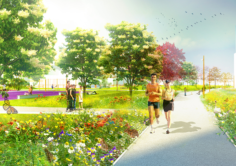 "The edges are treated as interfaces, establishing strong connections between the neighborhoods and the park," states Michiel van Driessche, landscape architect and partner of Felixx. "On the western side as a formal boulevard, accompanied by evergreen pine trees, creating a lasting experience in every season. On the eastern side as an informal walkway, planted with flowering shrubs and trees, creating a continually changing image. Between these two sides, a network of paths ensures that the park is part of the daily walking routes of all residents."