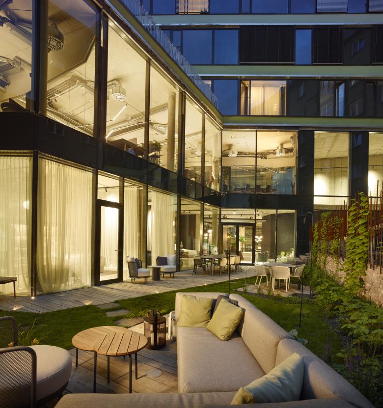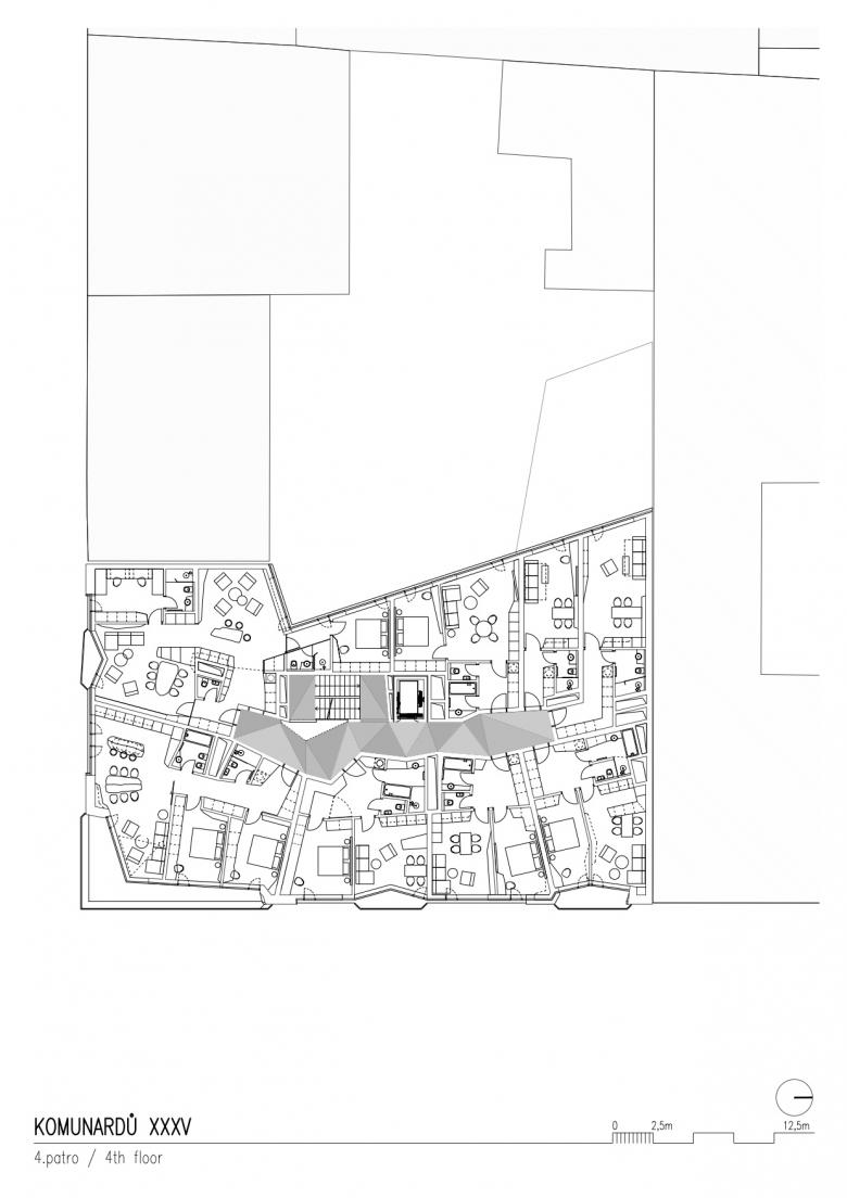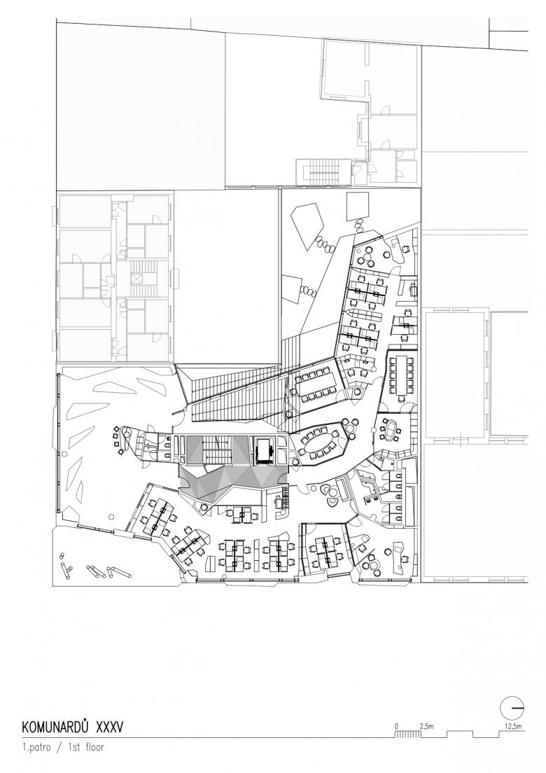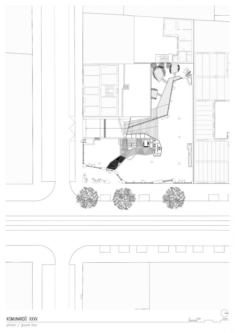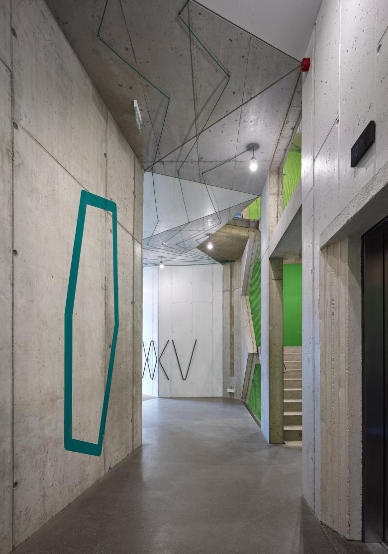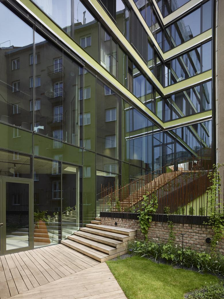 The task was to design a modern multi-purpose building that would universally meet all current expectations following from contemporary lifestyle and work practices, while confidently yet respectfully working with the historical and modern aspects of Holešovice.