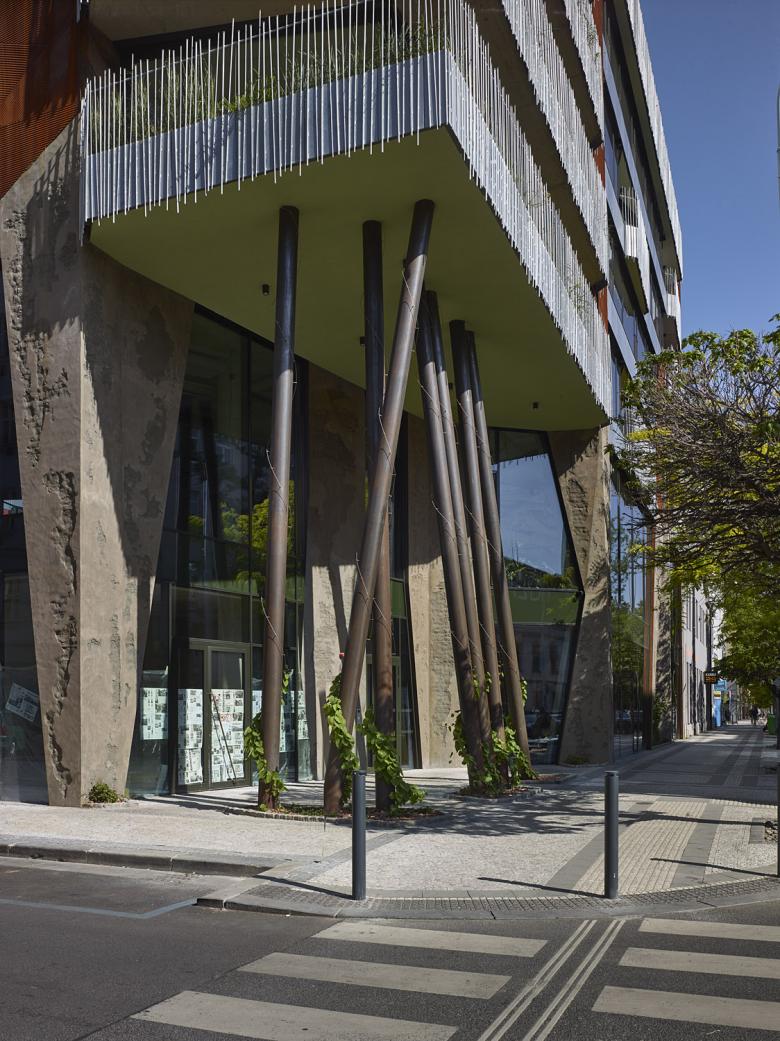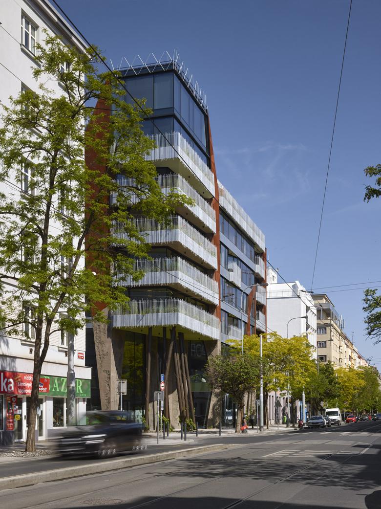 Artistically the building works with the industrial heritage of Holešovice, with the motivation to enrich it with luxurious greenery, which forms a dominant part of the whole concept, not only on terraces and balconies. Years in the future, climbing plants will cover the corner steel columns and the main stabilization concrete pillars that form the fundamental and characteristic look of the street front. This maintained and centrally watered greenery should climb up to higher levels and cover most of the visible concrete.
