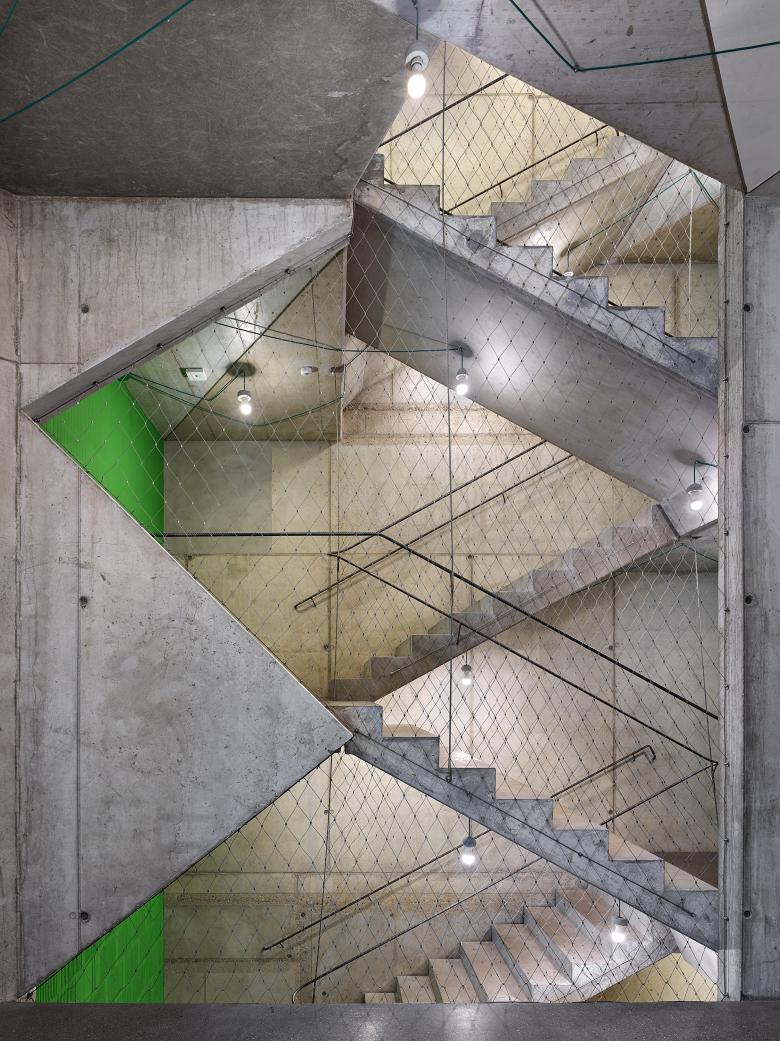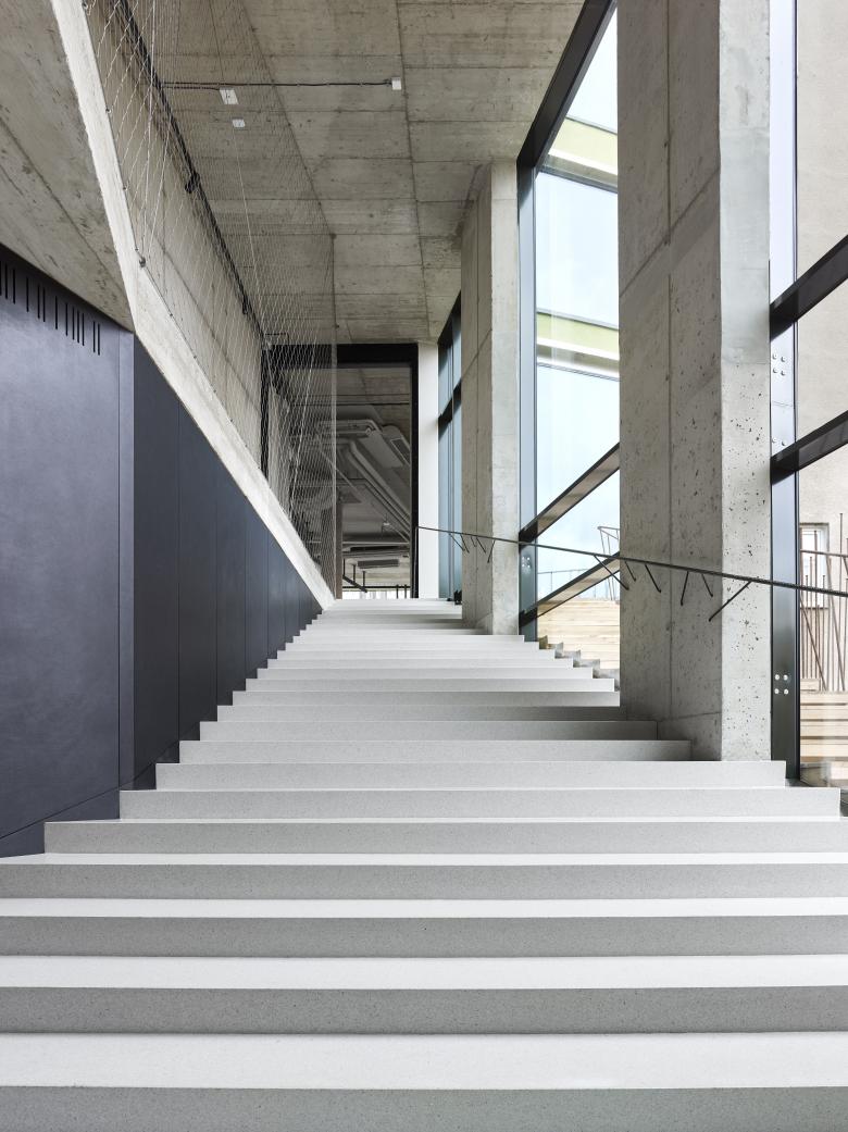 We strove to offer this main Holešovice avenue a two-story commercial parterre, as the genes of the building naturally reflected the connection to our older, successful project of revitalization of the Holport factory on the opposite side of the street. The time-tested operation of two commercial parterres gave us hope that similarly successful energies should also meet in our new building. Both floors are connected by a dominant staircase that goes through the glass façade all the way to the courtyard garden, creating a continuation of the public-oriented exhibition area.